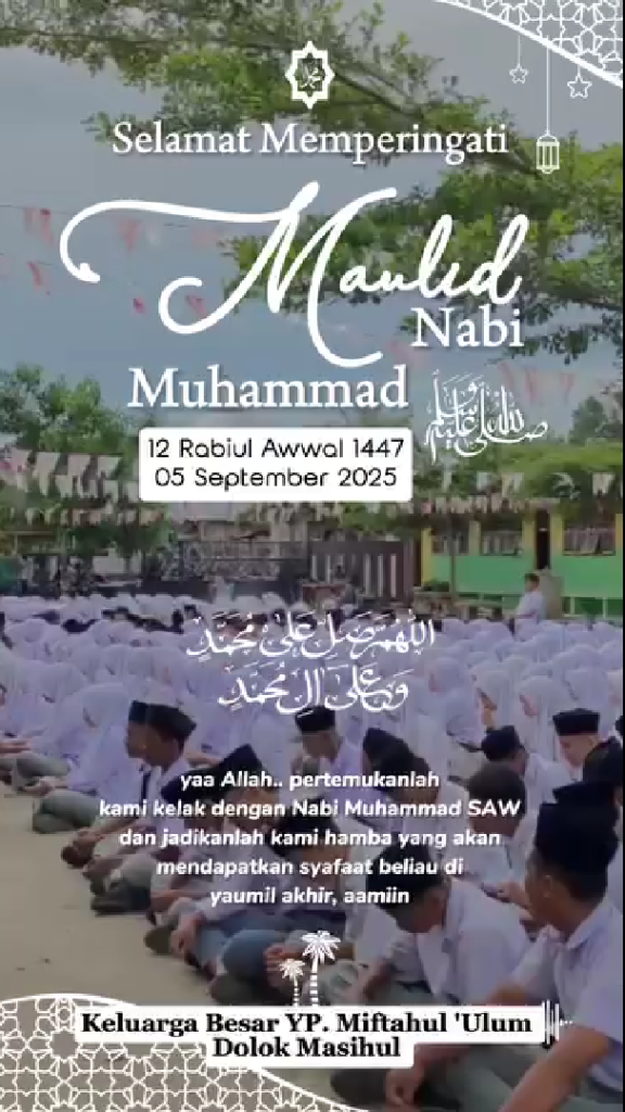 Dengan penuh rasa syukur kepada Allah SWT, Keluarga Besar YP Miftahul ’Ulum Dolok Masihul mengucapkan Selamat Memperingati Maulid Nabi Muhammad SAW, yang jatuh pada hari 12 Rabiul Awwal 1447 H / 5 September 2025 M. Semoga peringatan ini menjadi momen untuk meneladani akhlak mulia Rasulullah SAW dan memperkuat kecintaan kita kepadanya.